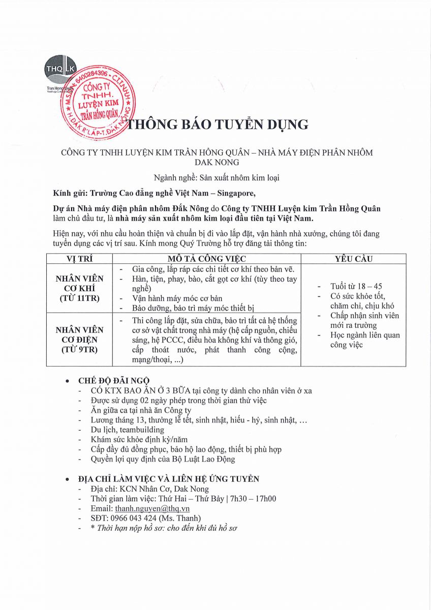 CÔNG TY TNHH LUYỆN KIM TRẦN HỒNG QUÂN - NHÀ MÁY ĐIỆN PHÂN NHÔM DAK NONG TUYỂN DỤNG