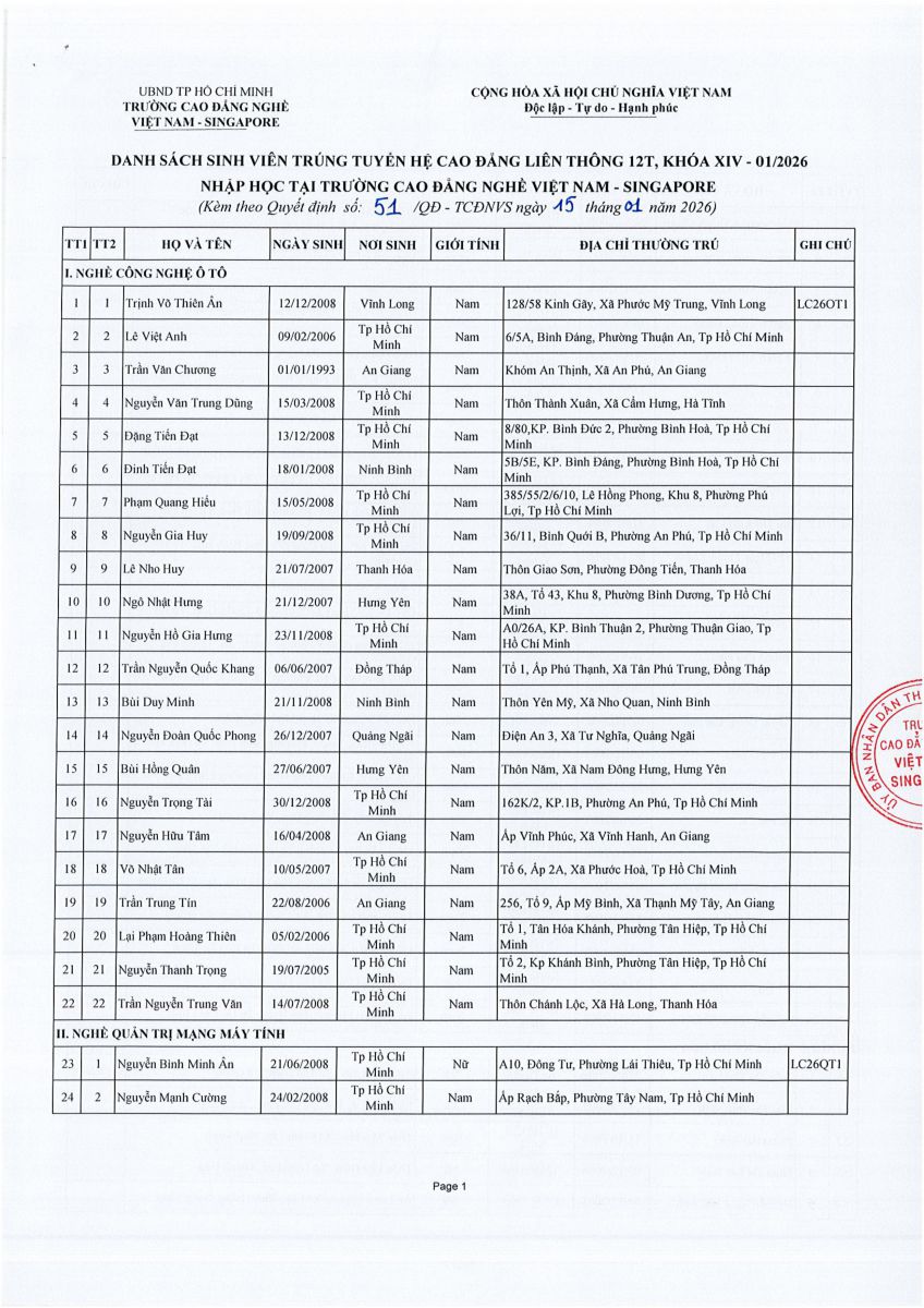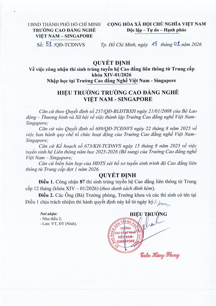 QUYẾT ĐỊNH VỀ VIỆC CÔNG NHẬN THÍ SINH TRÚNG TUYỂN HỆ CAO ĐẲNG LIÊN THÔNG TỪ TRUNG CẤP KHÓA XIV-01/2026
