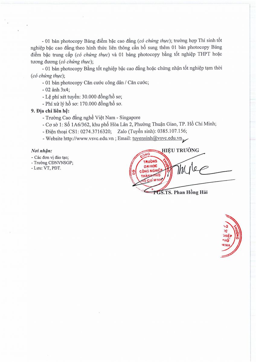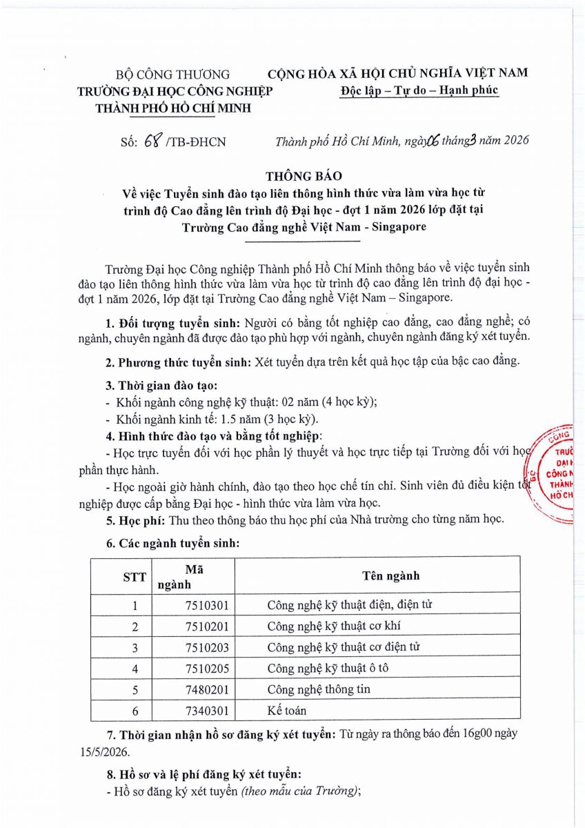 THÔNG BÁO VỀ VIỆC TUYỂN SINH ĐÀO TẠO LIÊN THÔNG HÌNH THỨC VỪA LÀM VỪA HỌC TỪ TRÌNH ĐỘ CAO ĐẲNG LÊN TRÌNH ĐỘ ĐAI HỌC - ĐỢT 1 NĂM 2026 LỚP ĐẶT TẠI TRƯỜNG CAO ĐẲNG NGHỀ VIỆT NAM - SINGAPORE