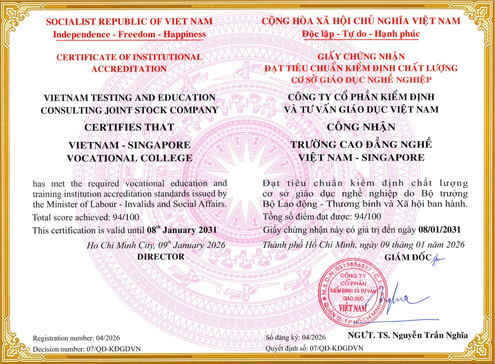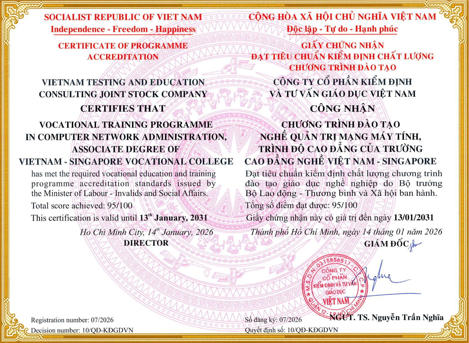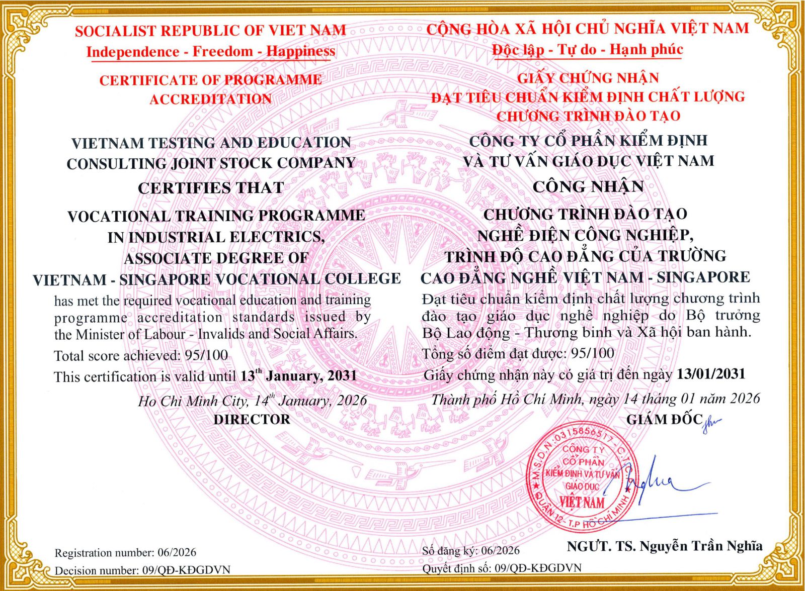 TRƯỜNG CAO ĐẲNG NGHỀ VIỆT NAM - SINGAPORE ĐẠT KIỂM ĐỊNH CHẤT LƯỢNG CƠ SỞ CHẤT LƯỢNG NGHỀ NGHIỆP, ĐẠT KIỂM ĐỊNH 2 NGHỀ ĐIỆN CÔNG NGHIỆP VÀ QUẢN TRỊ MẠNG MÁY TÍNH